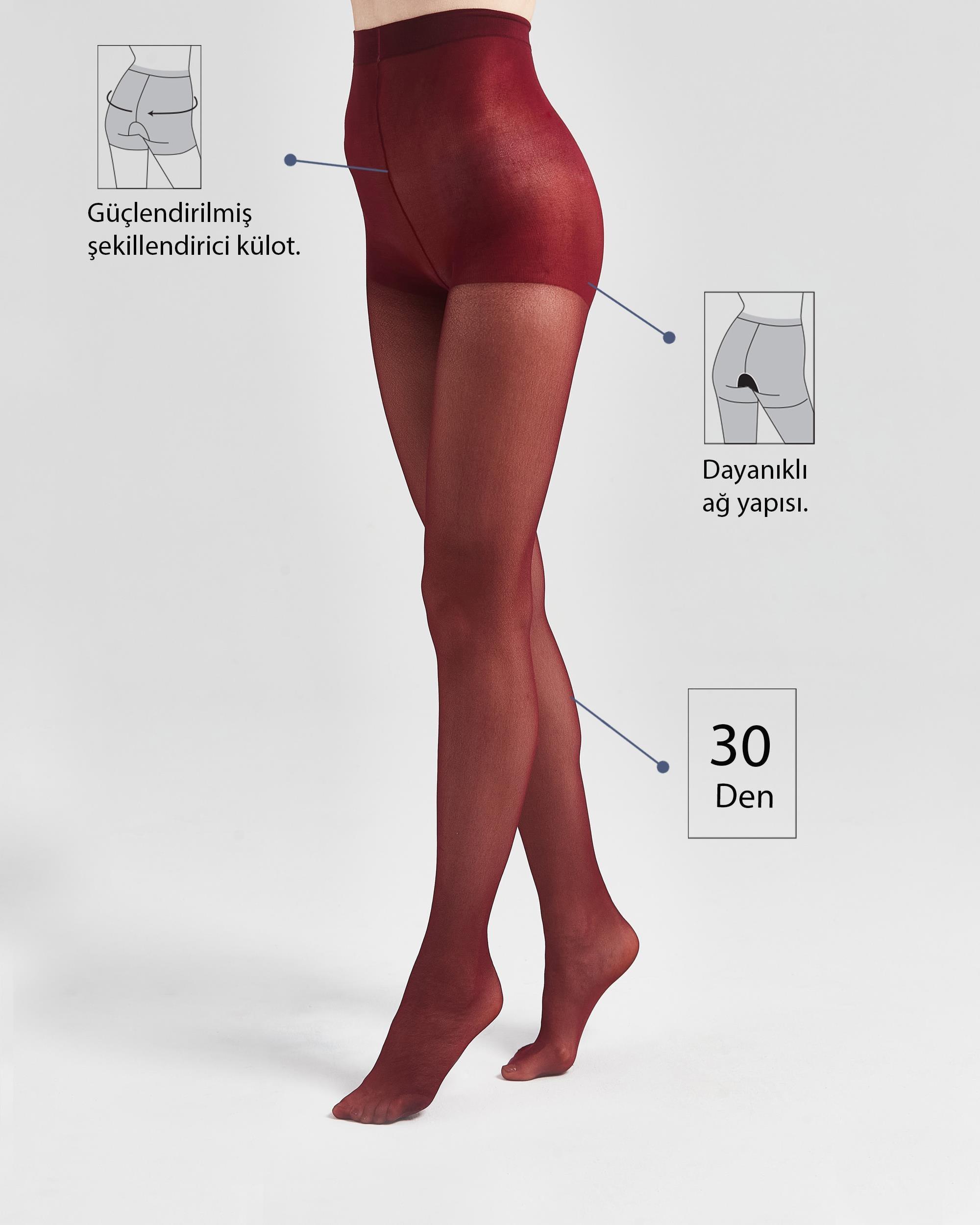 Kadın 30 Denye Bordo Külotlu Çorap, esnek yapısı sayesinde bacak hatlarını daha estetik gösterir. Cildi nazikçe sarar ve pürüzsüz bir görünüm sunar.