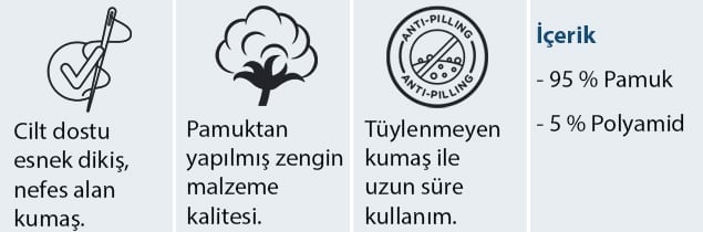 Yumuşak dokusu ve nefes alabilen kumaşı sayesinde gün boyu ferahlık sağlar. Tüylenmeye dayanıklı yapısı ile uzun süreli kullanımda bile formunu korur. Esnek bel bandı, vücuda tam uyum sağlayarak sıkmadan konforlu bir kullanım sunar.