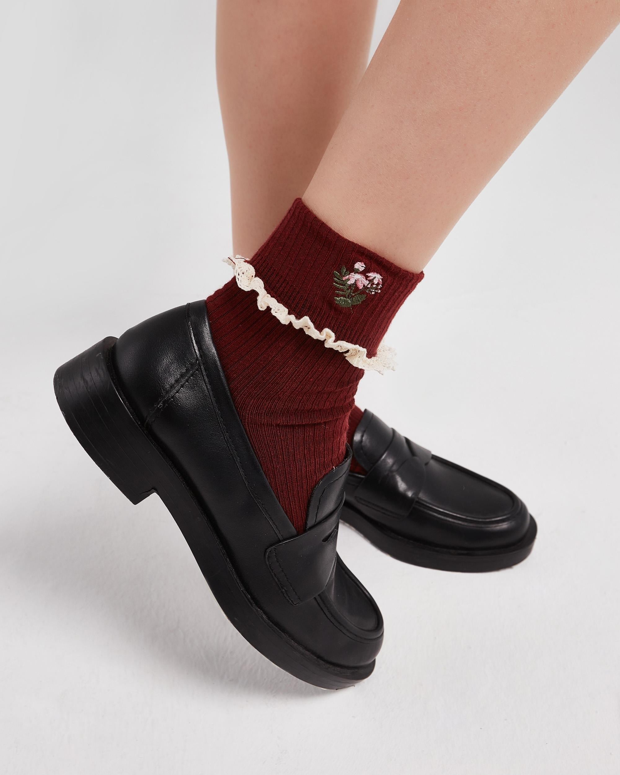 Kadın Dantelli Nakışlı Çorap Bordo, sade kombinleri bile bir anda göz alıcı hale getirebilir.
