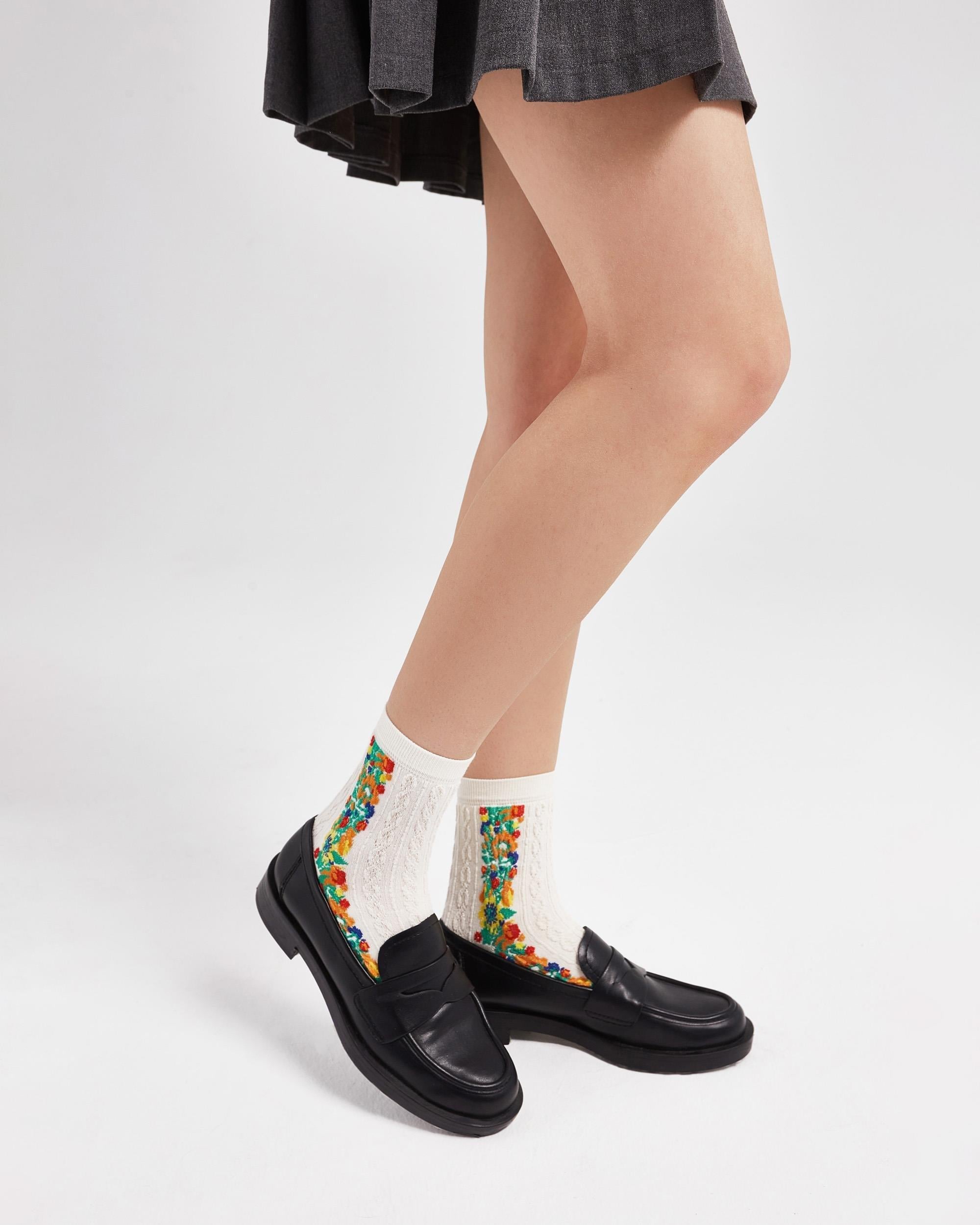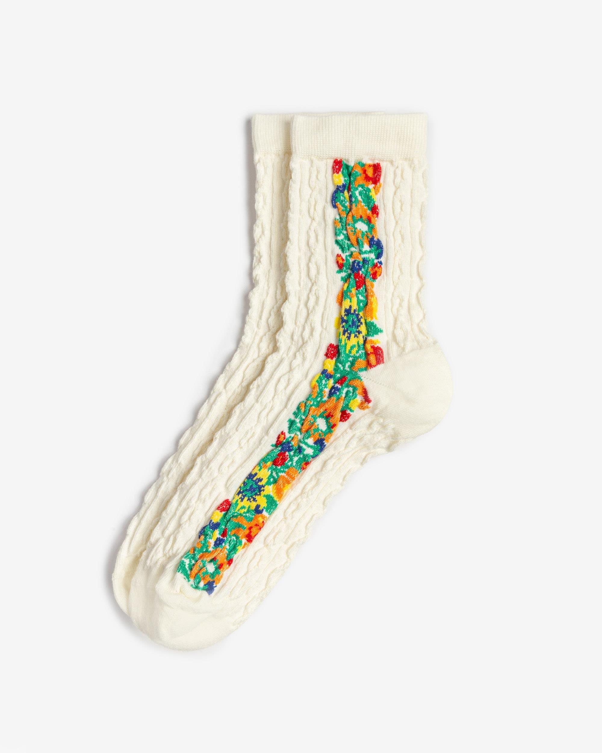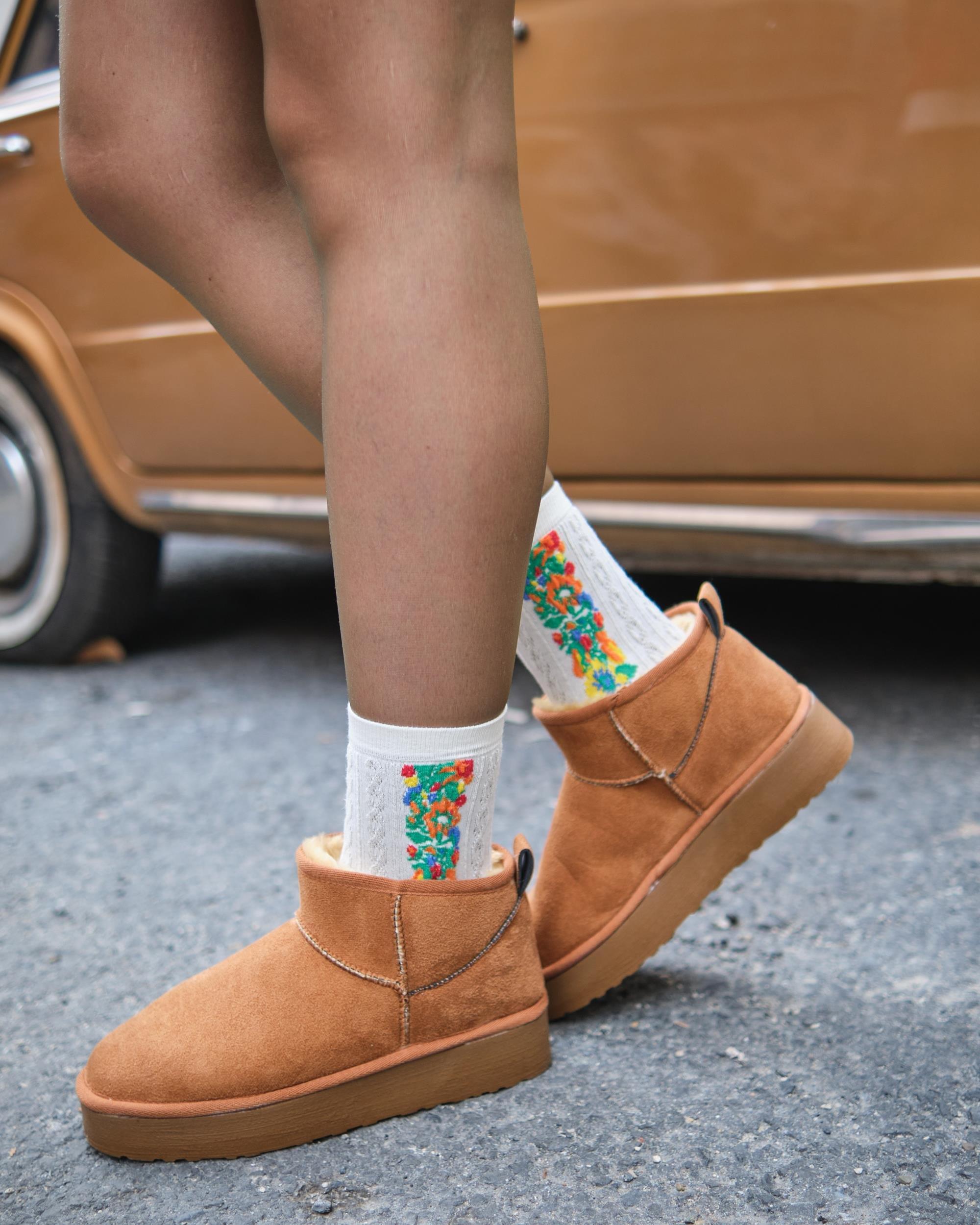 Jean veya basic elbiselerle kombinlendiğinde krem renkli çorap, etnik kabartma detaylarıyla stilinize zarif bir dokunuş yapar.