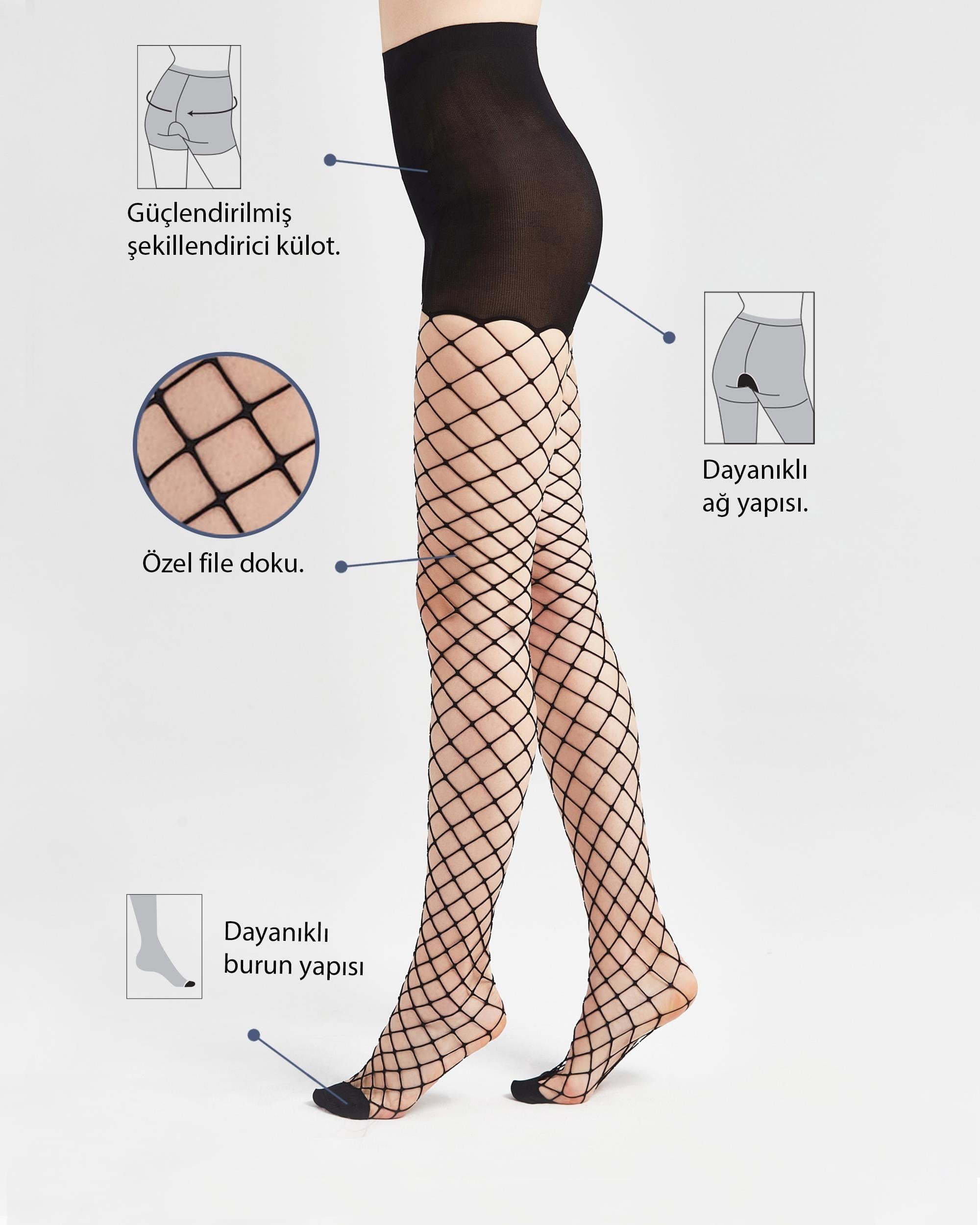 Balık ağı desenli file dokusu, hem cesur hem zarif bir ifade sunar. Klasik siyah rengiyle birleşen bu model, kadın stiline hem özgüven hem de şıklık kazandırır.