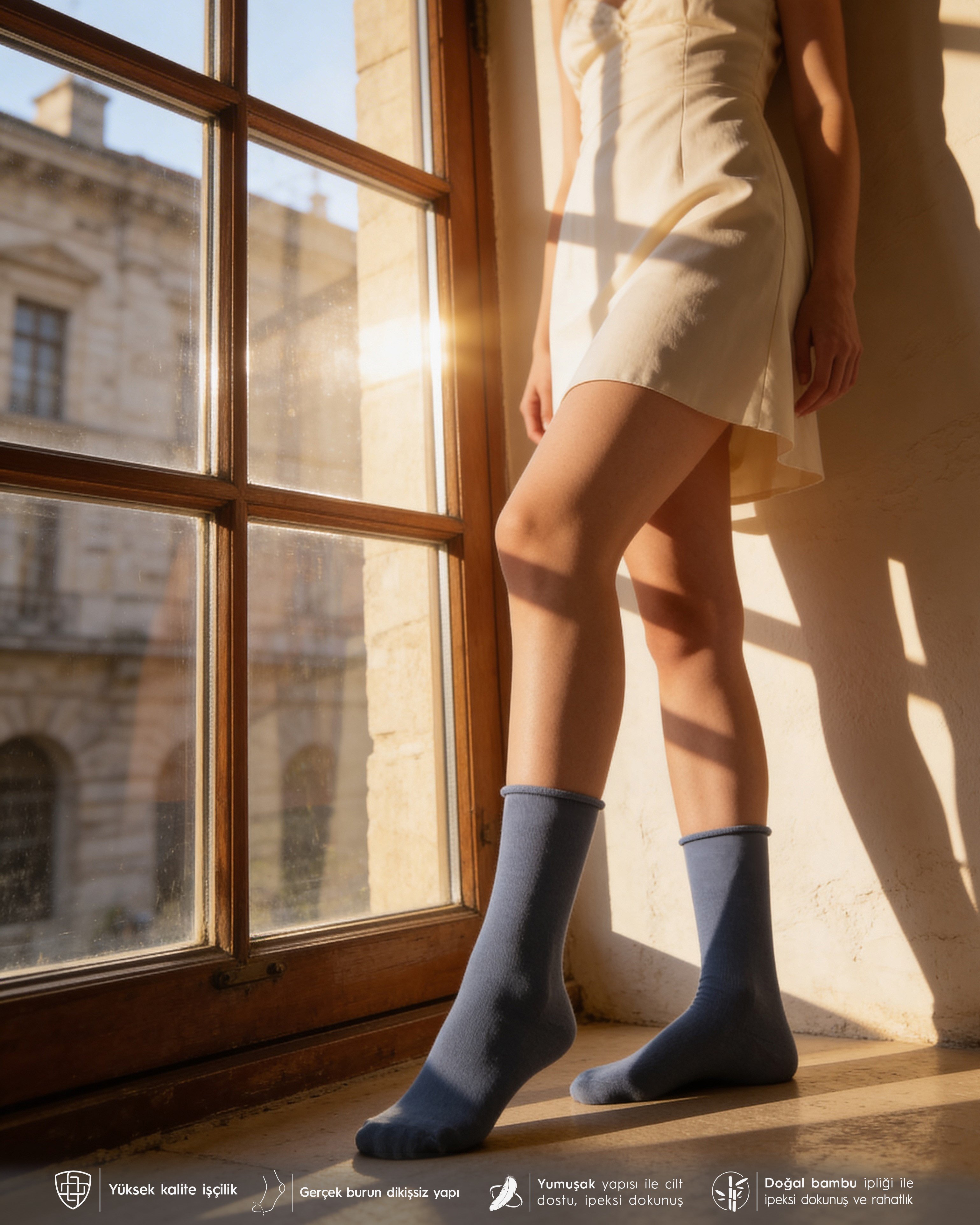 Bambu iplikten üretilen çoraplar, doğal lif yapıları sayesinde ayak sağlığını destekleyen özellikler sunar. Bu modelde kullanılan bambu dokusu; yumuşak, hafif ve nefes alabilen yapısıyla öne çıkar. Ayakla temas eden yüzeyin pürüzsüz olması, gün boyunca konfor hissinin korunmasına yardımcı olur ve hassas ayak yapısına sahip kadınlar için ideal bir kullanım sağlar.